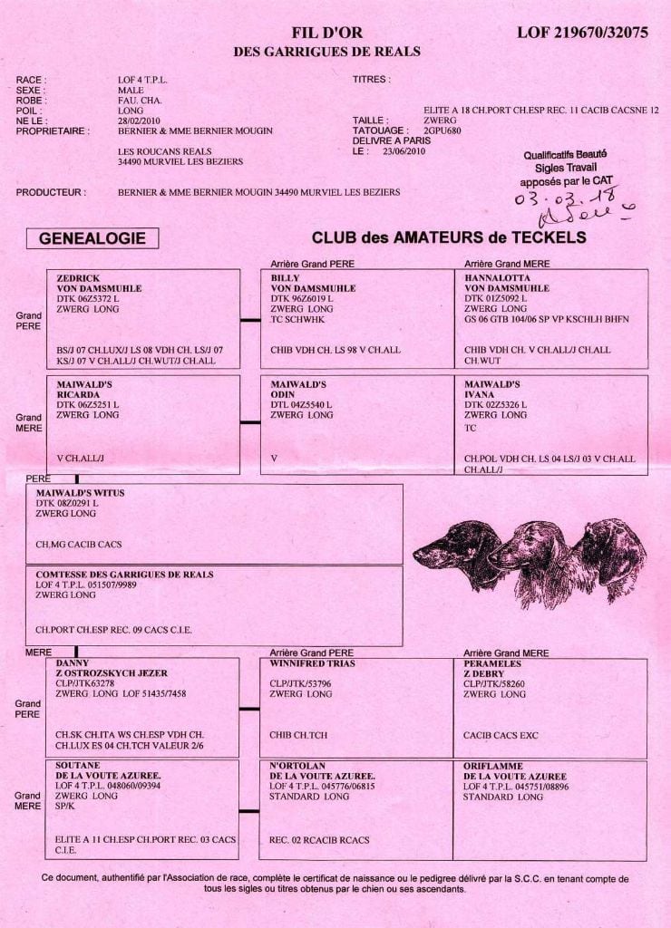 ADN 2015 : identification génétique ADN Filiation 2016 : DNA Compatible Dention 2011 : DCC conforme et complète MHOC 2011 : indemne APR-CAT MHOC 2017 : indemne APR |